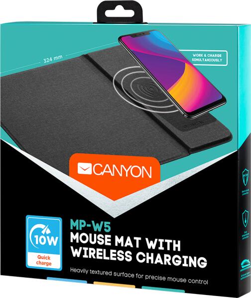 CANYON MP-W5, Mouse Mat with wireless charger, Input 5V/2A, 9V2A Output 5W/7.5W/10W, 324*244*6mm, USB Type C cable length 1m, Black, 220g (CNS-CMPW5)